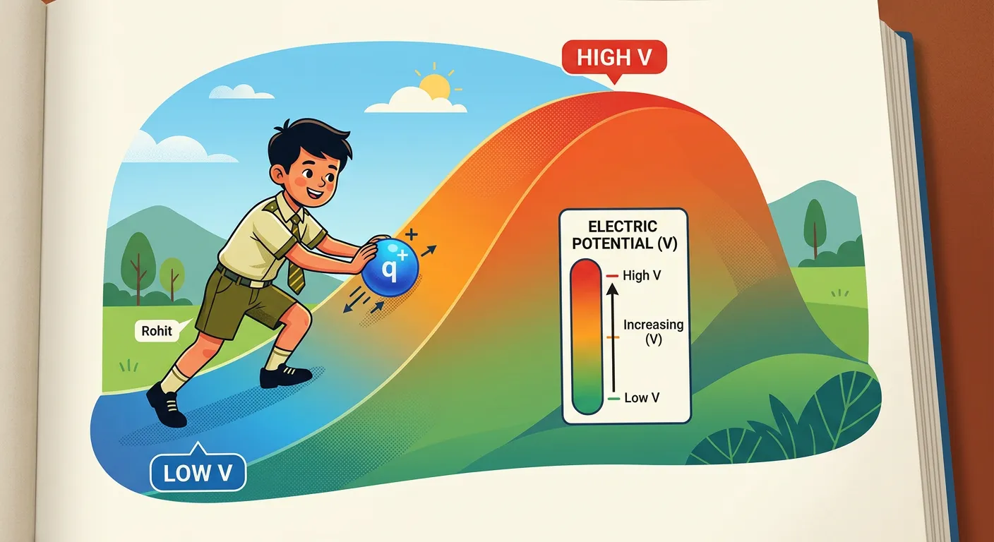 Hey potential future doctors! Imagine pushing a boulder up a hill. The higher you go, the more energy you store. Electric potential (V) is like that electrical height—it tells us how much work is done to bring a unit charge to that point.