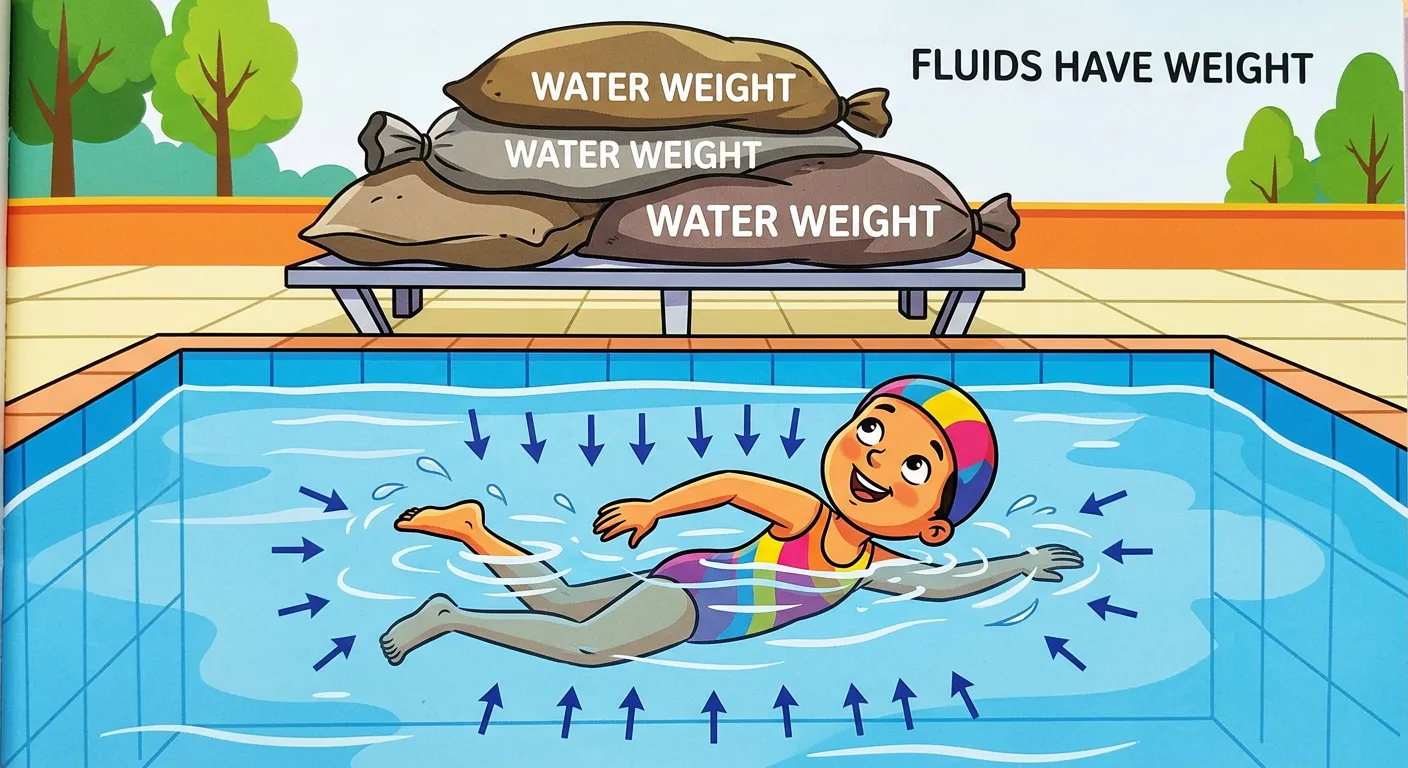 Hello future doctors! Have you ever noticed that the deeper you dive into a swimming pool, the more your ears pop? This is because fluids, like water, actually have weight, and that weight presses down on you from all sides!