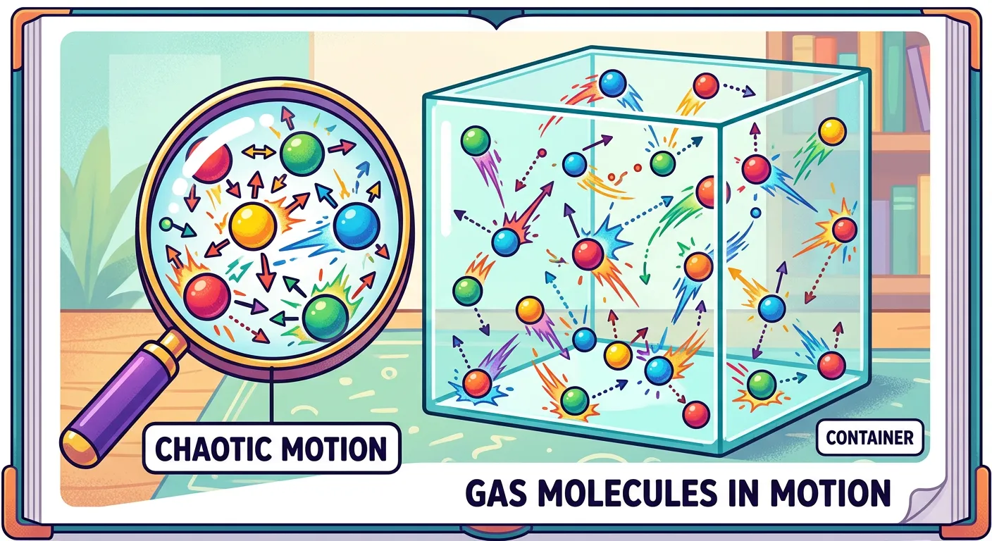 Imagine a super-crowded railway station like Mumbai CSMT! Everyone is running randomly, hitting each other. This is exactly how gas molecules behave in a container! They're in constant, chaotic motion, always colliding. We need a way to understand their average behavior.