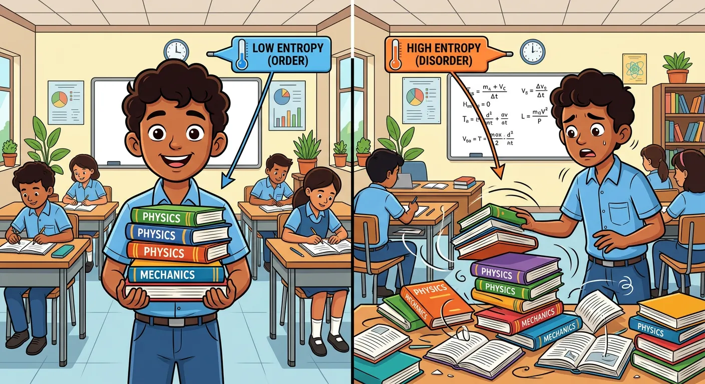Welcome, future doctors! Today, we're unlocking the mystery of why *time only flows forward* and why your neatly stacked books always end up in a mess! That’s the Second Law of Thermodynamics, and it’s about a fascinating concept called **Entropy**, which measures randomness or disorder. Let’s jump in!