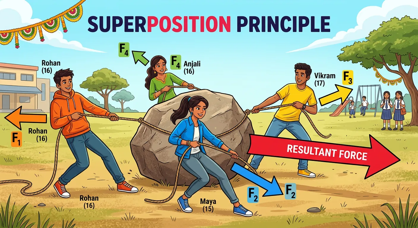 Hey future doctors! Ever wondered what happens when multiple charges act on a single charge? Think of a group project. The total effort is just the vector sum of everyone's contribution. That's the Superposition Principle!