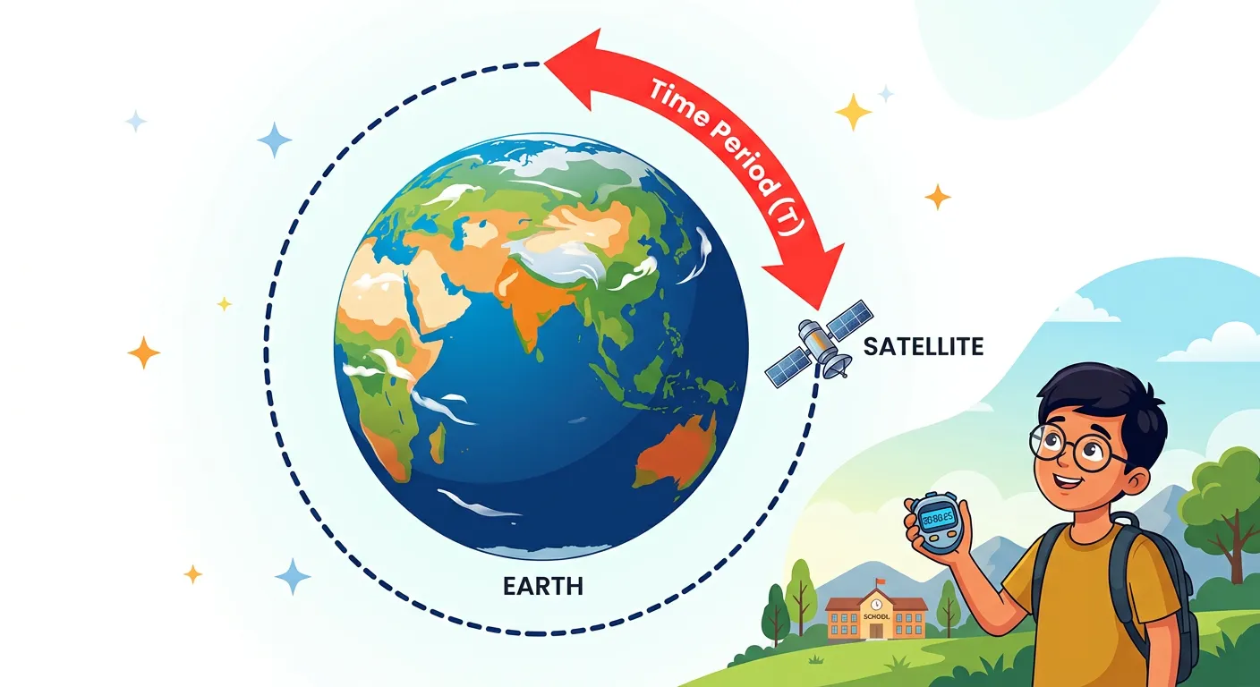 Hello future doctors! Ever wonder how long a satellite takes to orbit Earth? It's just like doing *parikrama* at a temple. The time taken to complete one full revolution is called its 'Time Period', denoted by T. Simple, right?