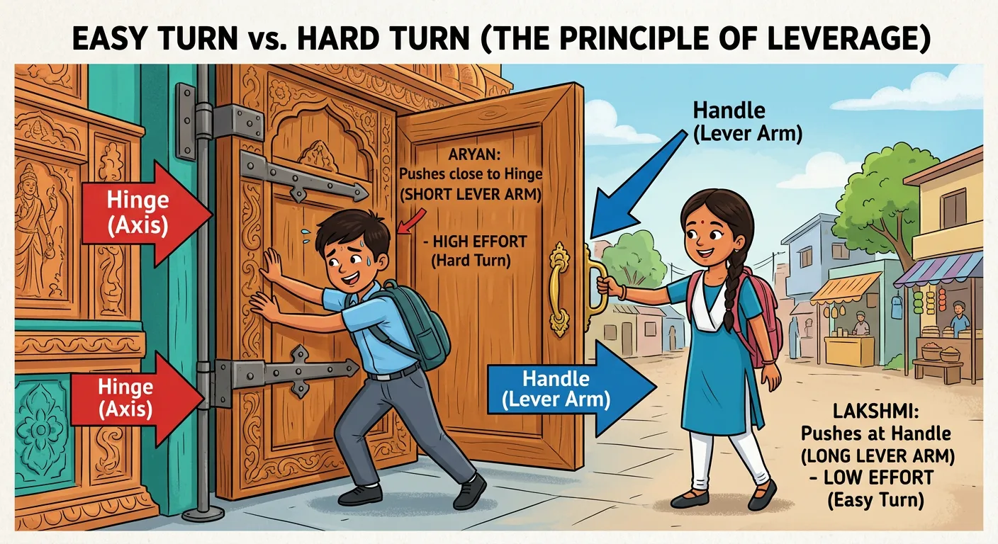 Hello students! Welcome to the fascinating world of Torque. Think about opening a heavy temple door. Pushing near the hinge is tough, but pushing near the handle makes it easy, right? This 'turning effect' is what we call Torque!