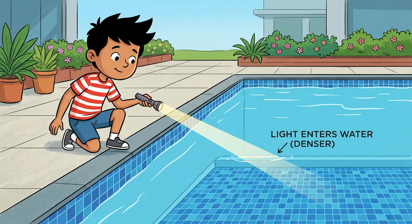 Meet Rohan! He’s shining a torch into a swimming pool. Have you ever noticed how light bends when it goes from air into water? This is normal refraction. But what happens when the light tries to travel the *other* way, from the denser water back into the air? This is where the story of TIR begins!