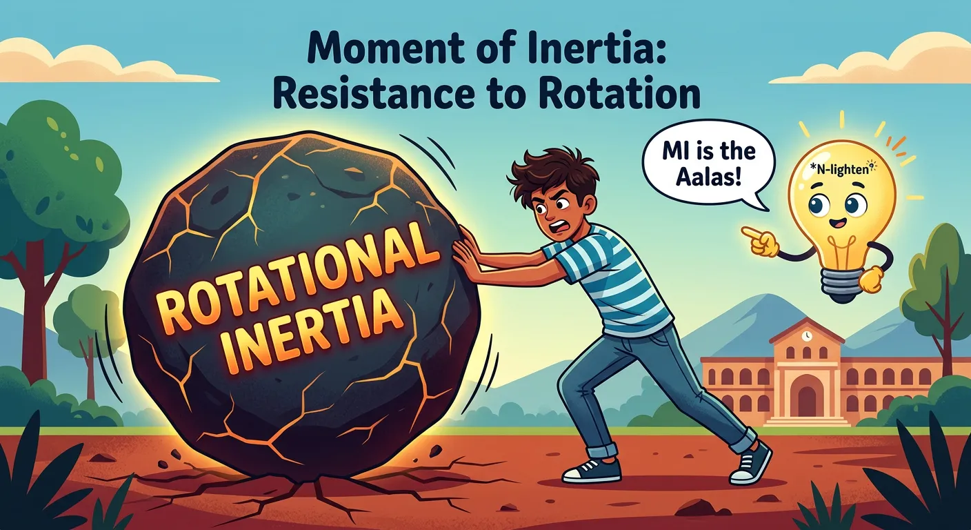 Hello future doctors! Remember how inertia in linear motion is 'aalas' to move? In rotation, it's called Moment of Inertia, or MI. It measures how stubborn an object is to start spinning! Every shape has its own unique 'aalas' value. Let's find out!