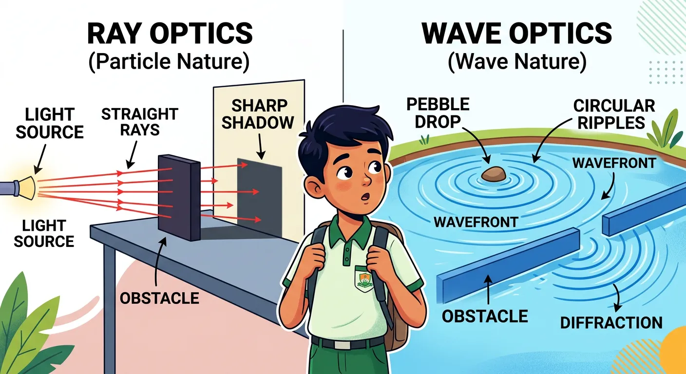 Hello future doctors! Ray Optics showed us light travels in straight lines. But Wave Optics reveals light's true nature—it bends and spreads just like ripples in a pond! This explains fascinating phenomena that straight rays cannot.