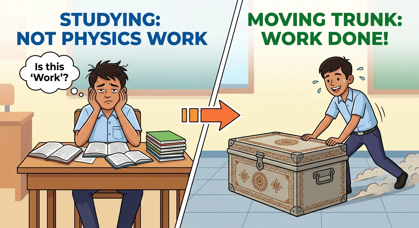 Hey future doctors! We 'work' hard studying for NEET, right? But in Physics, sitting still isn't work! Work happens only when you push or pull something, and it actually *moves*. Let's learn the real definition!